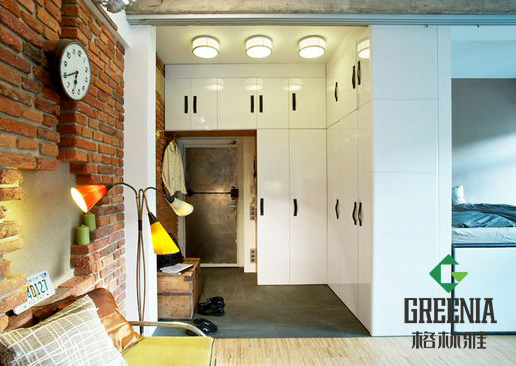 比起女生公寓,男生公寓在風格上的選擇似乎相當有限,而近年來相當流行的Loft風格既不會讓公寓設計過于刻意,又能體現主人的藝術氣息。上圖選用純色防火板作為貼面定制家具,簡單實在,經濟實用,又不失自己的風格。