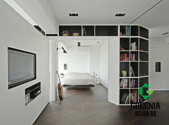 小戶型裝修時要恰當分隔出每個區間,采用防火隔斷不僅能增加空間的私密性,也能創造一道墻,讓你放置其他家居用品。單身生活中需要注重整潔條例,靈活收納則是必不可少的一門功夫,多利用墻面空間和墻角空間做好收納工作,可以讓生活變得井井有條。圖中都選用的是黑白配的防火板裝修和家具,格調統一,能讓房間產生大空間的錯覺。