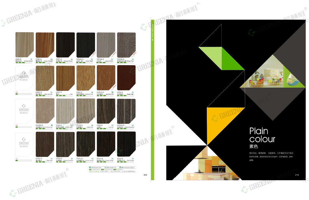 格林雅防火板擁有55種表面處理及3532種花色紋路,品種齊全。包括光面G、啞面M、絨面S、油漆P、霧面WS、波浪紋RS、壓木紋X、編織紋PX、優雅皮紋XO、皮紋SL、壓木紋SH、拉絲ST、刷木紋F、優雅刷木紋MF、絲絨面CF、羽翎面FT、纖絲紋、天然木皮、影點U、橫紋E、豎紋H、雨絲紋MV、橫紋WH、原木刷紋WB等多種不同的表面處理,可做成平板、彎曲板。歡迎您來樣定做!