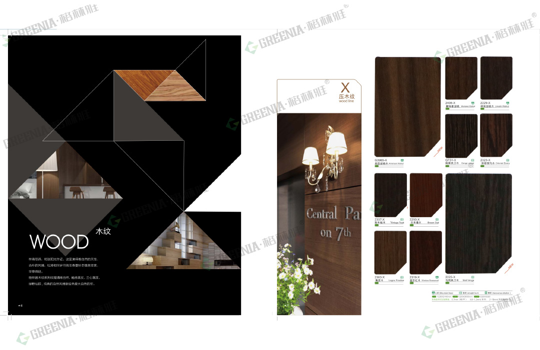 格林雅防火板擁有55種表面處理及3532種花色紋路,品種齊全。包括光面G、啞面M、絨面S、油漆P、霧面WS、波浪紋RS、壓木紋X、編織紋PX、優雅皮紋XO、皮紋SL、壓木紋SH、拉絲ST、刷木紋F、優雅刷木紋MF、絲絨面CF、羽翎面FT、纖絲紋、天然木皮、影點U、橫紋E、豎紋H、雨絲紋MV、橫紋WH、原木刷紋WB等多種不同的表面處理,可做成平板、彎曲板。歡迎您來樣定做!