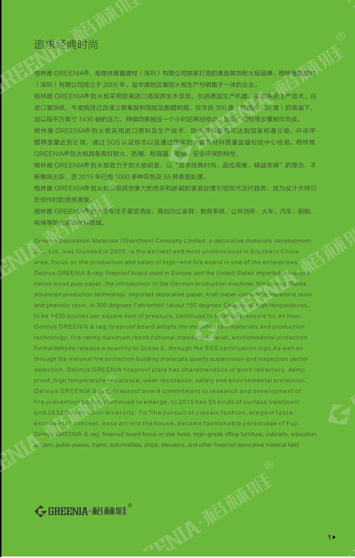 格林雅是一家有15年歷史的專業(yè)研發(fā)及生產(chǎn)高壓裝飾耐火板廠家,具有精良的設備和雄厚的技術力量。格林雅提供完整系列的表面裝飾產(chǎn)品,包括防火板,抗倍特板,玻鎂防火板,理化板和鋁蜂窩復合板。