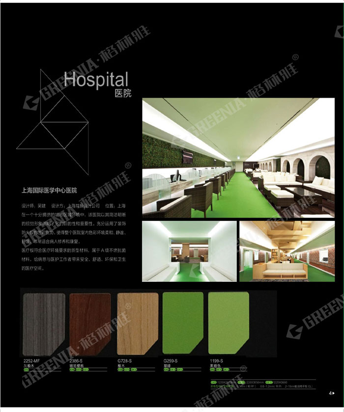 格林雅防火板廣泛用于商業(yè)場所等公共空間、教育科研、酒店、賓館、KVT、醫(yī)院、學校、實驗室、化學室、咖啡廳、餐廳、體育館、健身房、交通工具等領域。