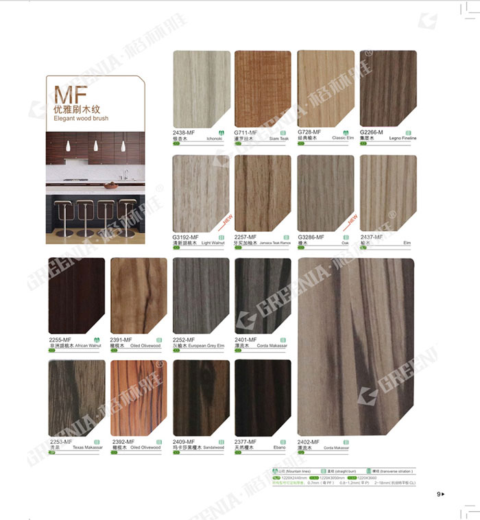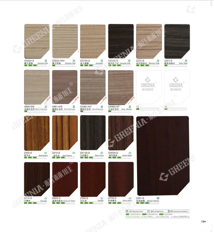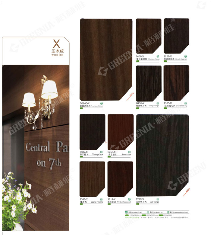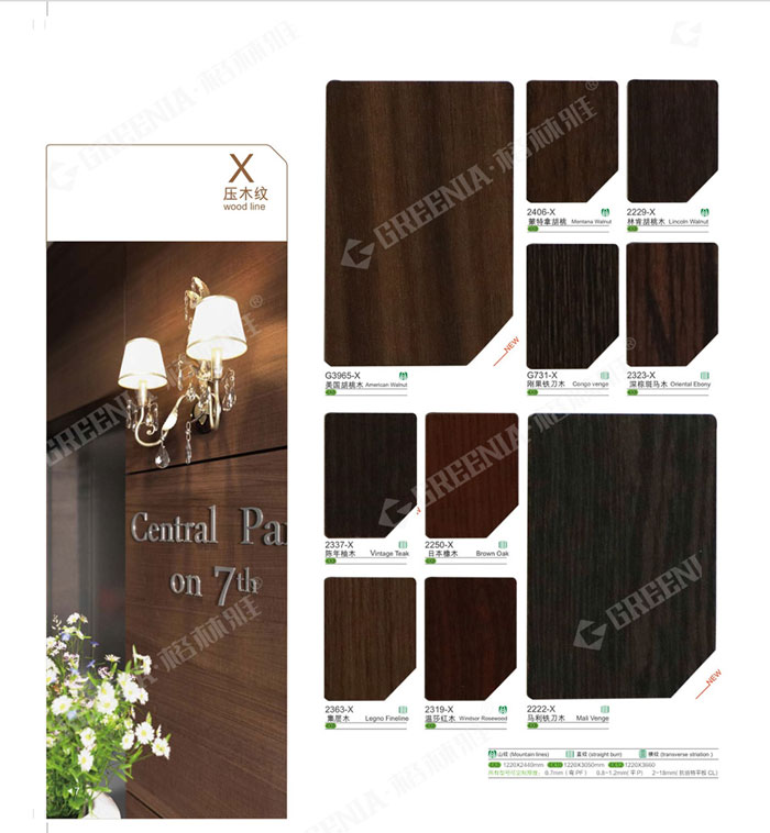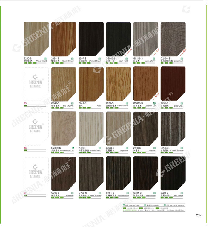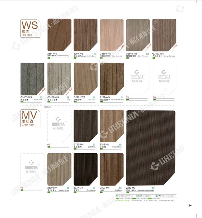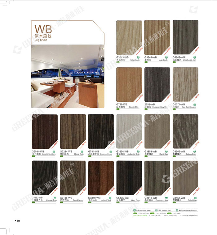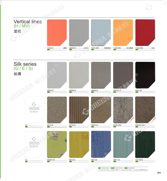 格林雅防火板擁有55種表面處理及3532種花色紋路,品種齊全。包括光面G、啞面M、絨面S、油漆P、霧面WS、波浪紋RS、壓木紋X、編織紋PX、優(yōu)雅皮紋XO、皮紋SL、壓木紋SH、拉絲ST、刷木紋F、優(yōu)雅刷木紋MF、絲絨面CF、羽翎面FT、纖絲紋、天然木皮、影點U、橫紋E、豎紋H、雨絲紋MV、橫紋WH、原木刷紋WB等多種不同的表面處理,可做成平板、彎曲板。歡迎您來樣定做!