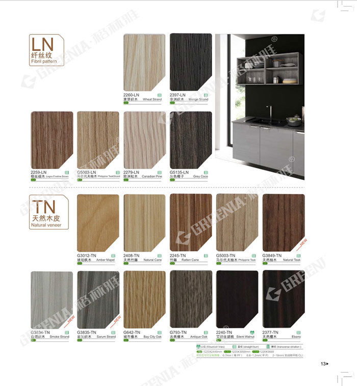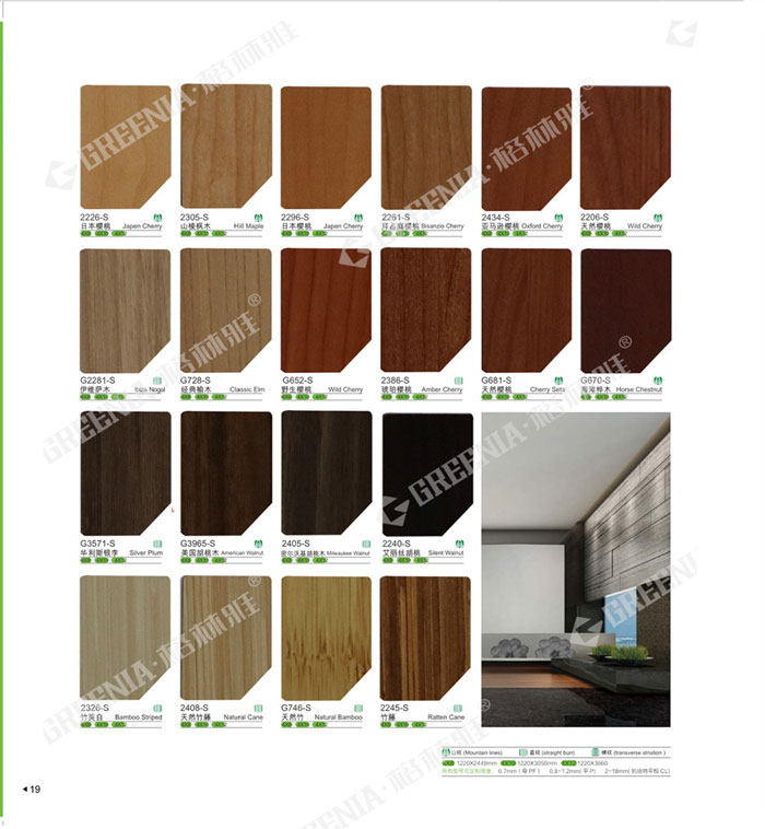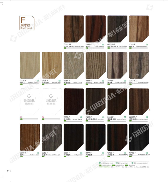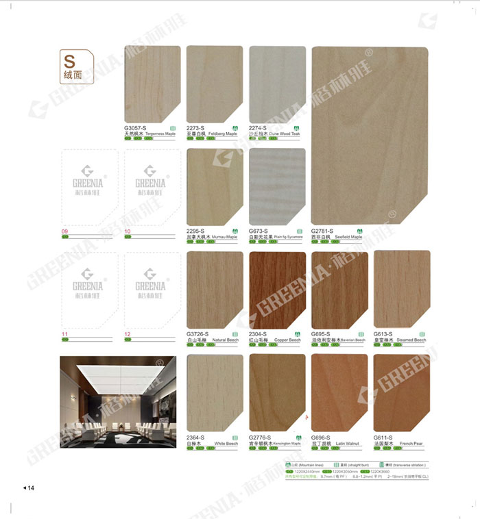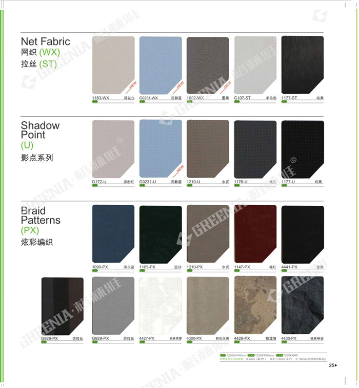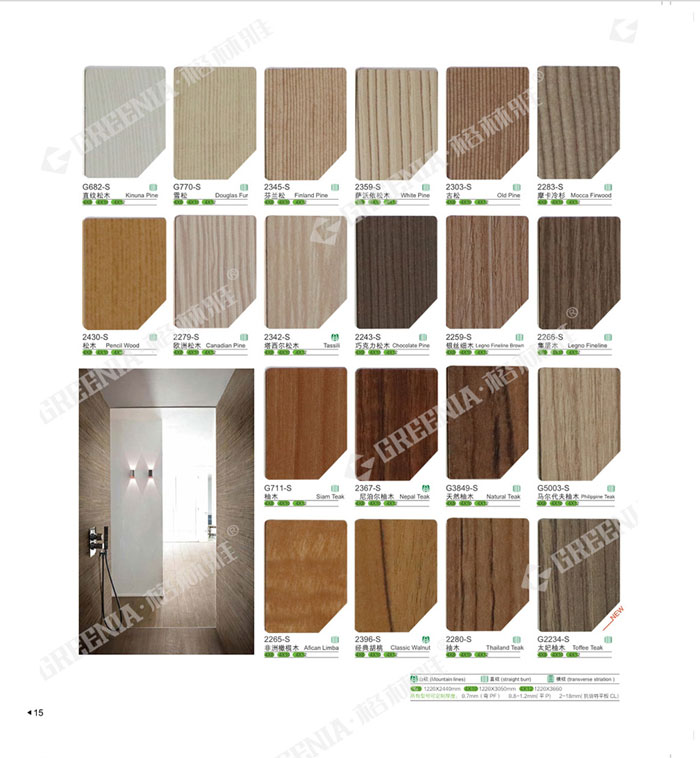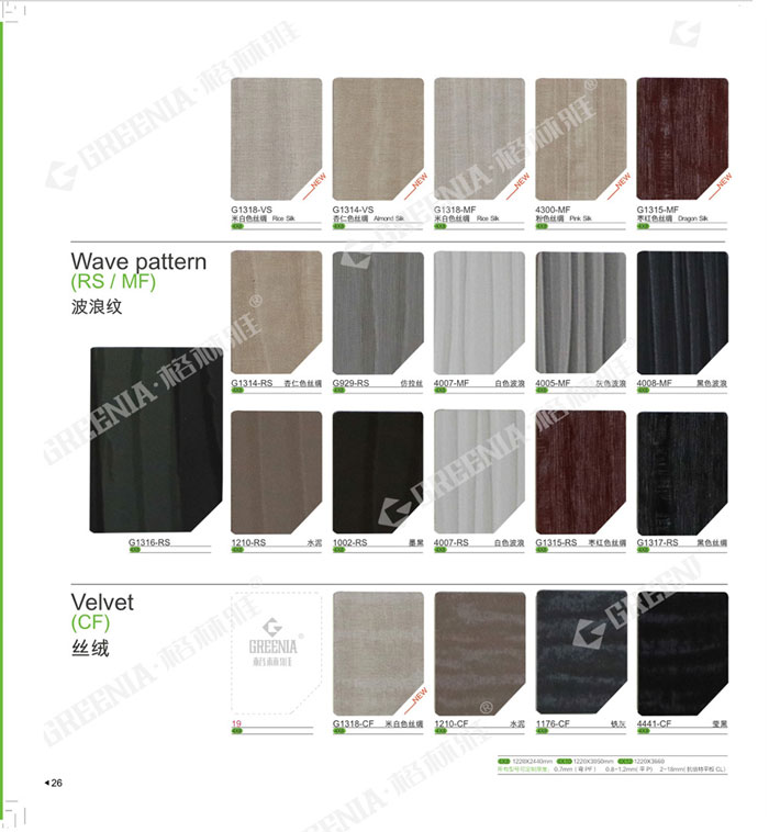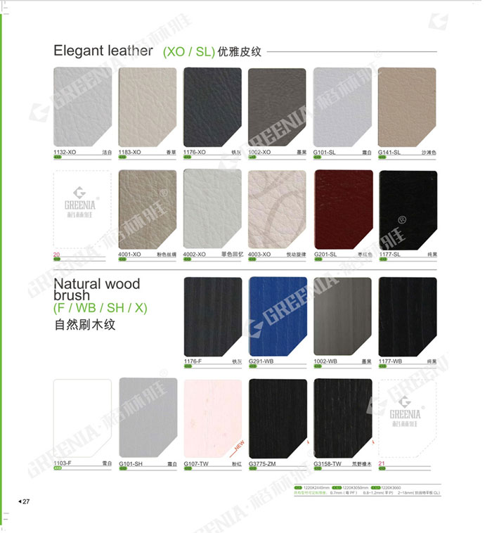 格林雅防火板擁有55種表面處理及3532種花色紋路,品種齊全。包括光面G、啞面M、絨面S、油漆P、霧面WS、波浪紋RS、壓木紋X、編織紋PX、優(yōu)雅皮紋XO、皮紋SL、壓木紋SH、拉絲ST、刷木紋F、優(yōu)雅刷木紋MF、絲絨面CF、羽翎面FT、纖絲紋、天然木皮、影點U、橫紋E、豎紋H、雨絲紋MV、橫紋WH、原木刷紋WB等多種不同的表面處理,可做成平板、彎曲板。歡迎您來樣定做!