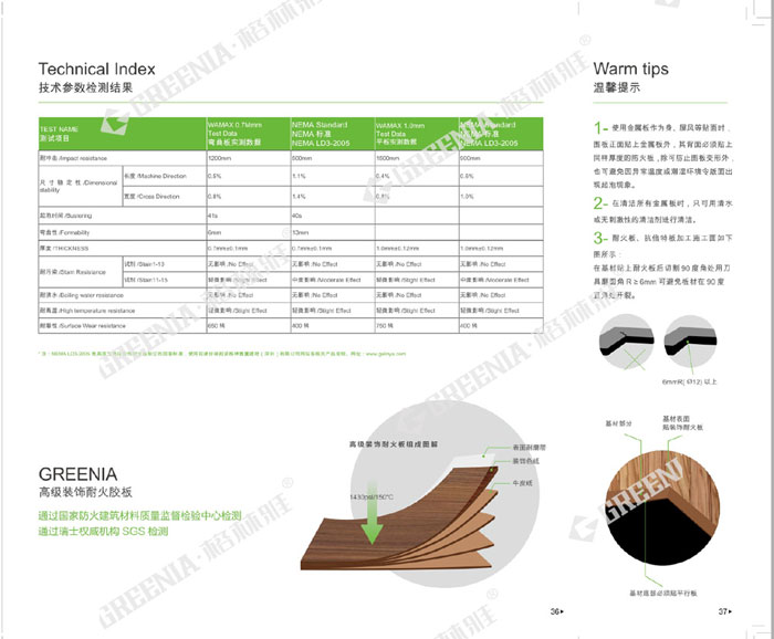 格林雅高級裝飾耐火板采用國外進口高級原生木漿紙,引進了國外的先進技術。由浸過三聚氰胺的裝飾紙和浸過酚醛樹脂膠的牛皮紙在烘干之后,以裝飾紙在上,牛皮紙在下的方式排疊,放置于熱壓力機下,在華氏300度(約攝氏150度)的高溫下,加以每平方英寸1430磅的壓力,持續(xù)均衡施壓一個小時后再經(jīng)修邊、砂磨、品質(zhì)檢測等步驟制作而成。