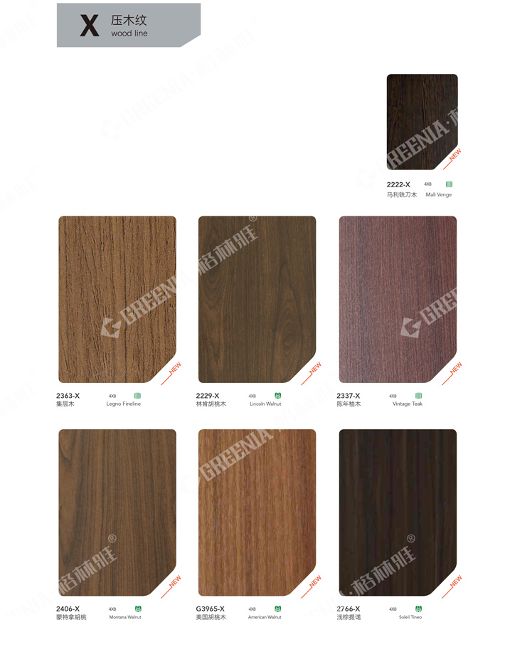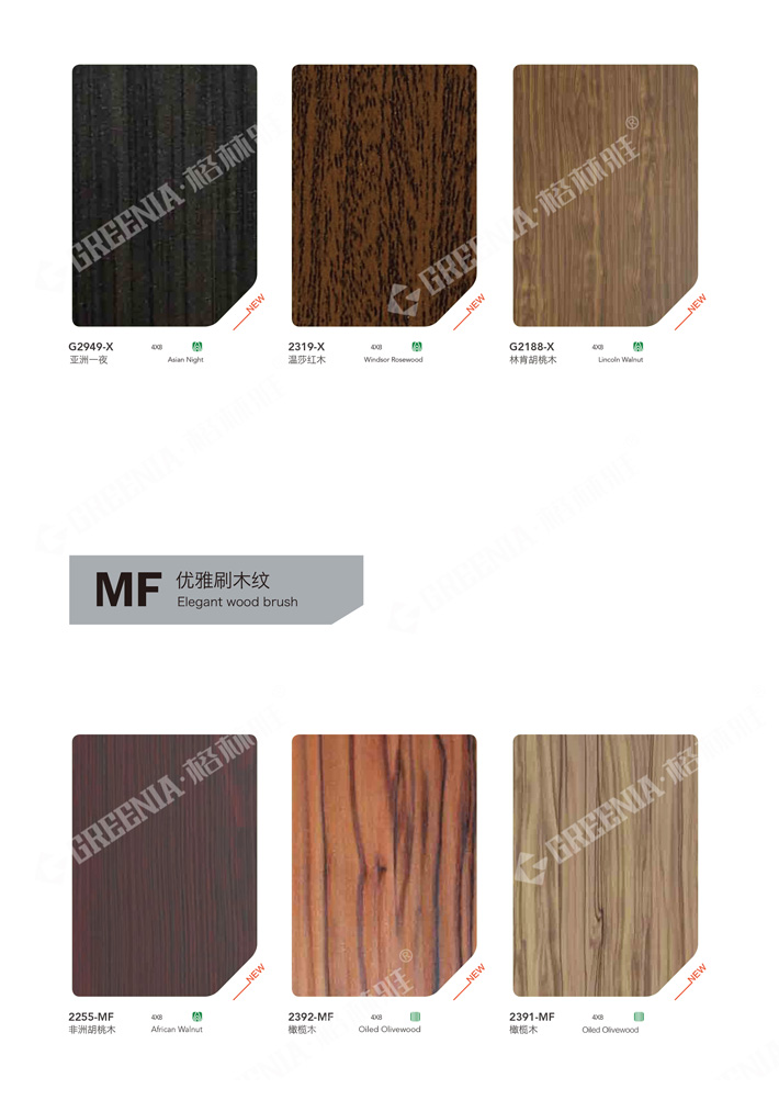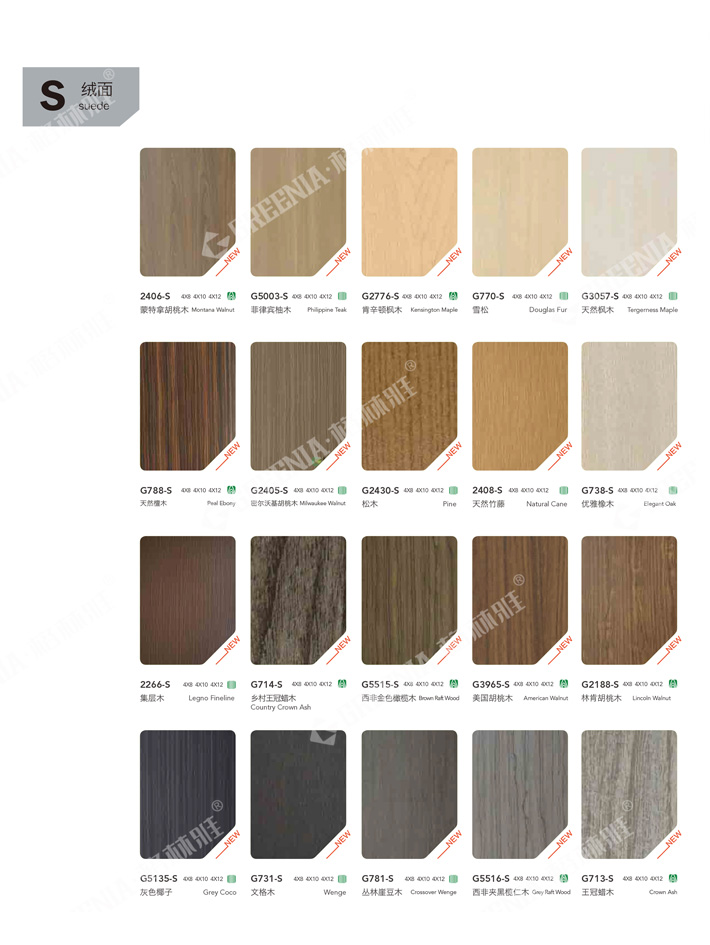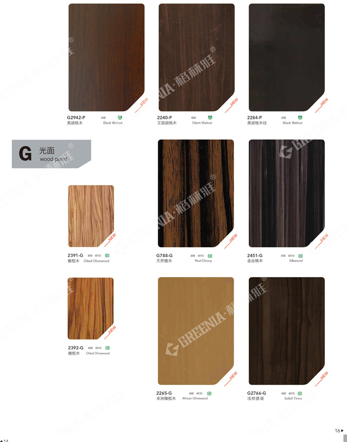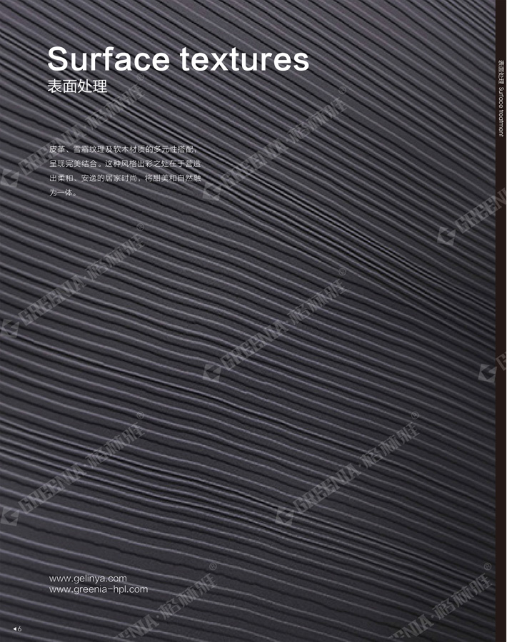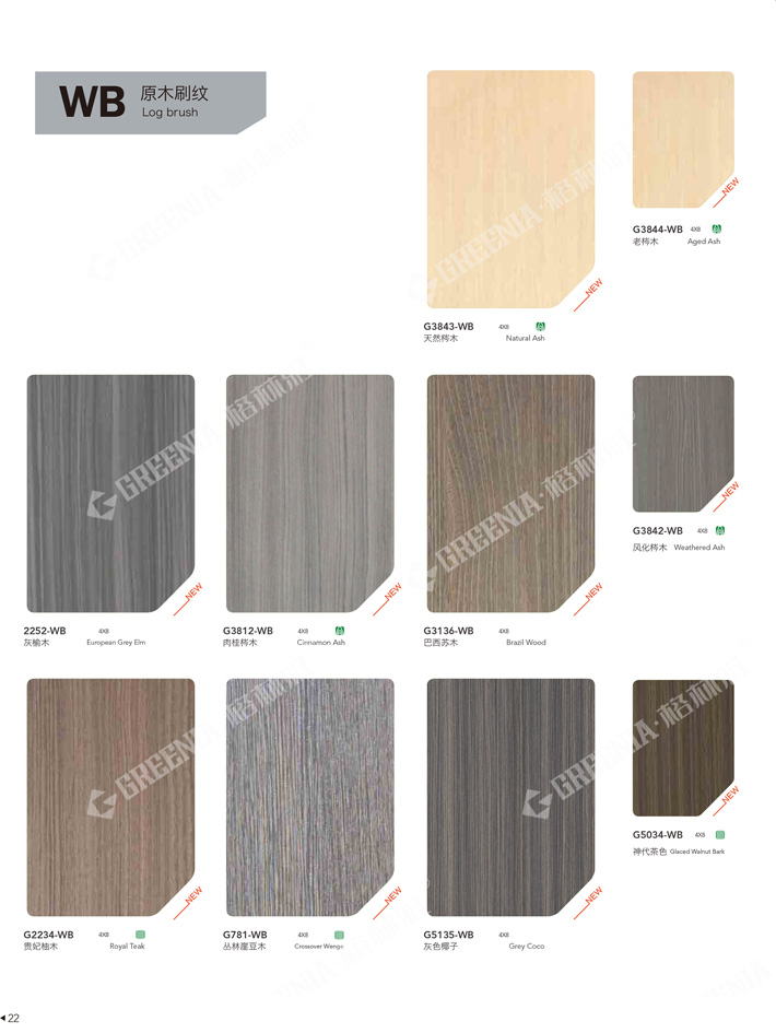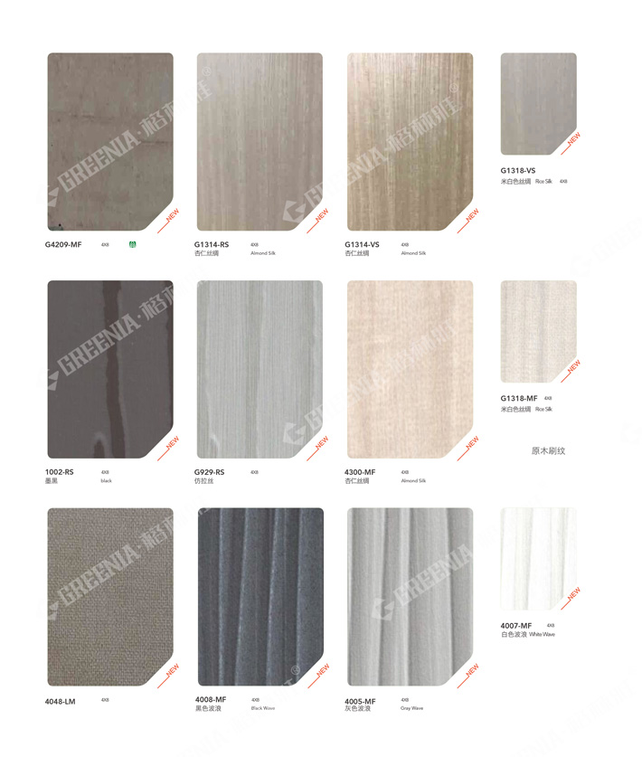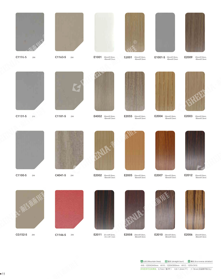 格林雅防火板擁有55種表面處理及3532種花色紋路,品種齊全。包括光面G、啞面M、絨面S、油漆P、霧面WS、波浪紋RS、壓木紋X、編織紋PX、優雅皮紋XO、皮紋SL、壓木紋SH、拉絲ST、刷木紋F、優雅刷木紋MF、絲絨面CF、羽翎面FT、纖絲紋、天然木皮、影點U、橫紋E、豎紋H、雨絲紋MV、橫紋WH、原木刷紋WB等多種不同的表面處理,可做成平板、彎曲板。歡迎您來樣定做!