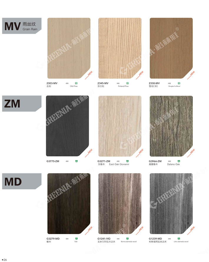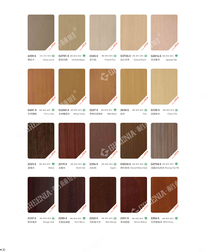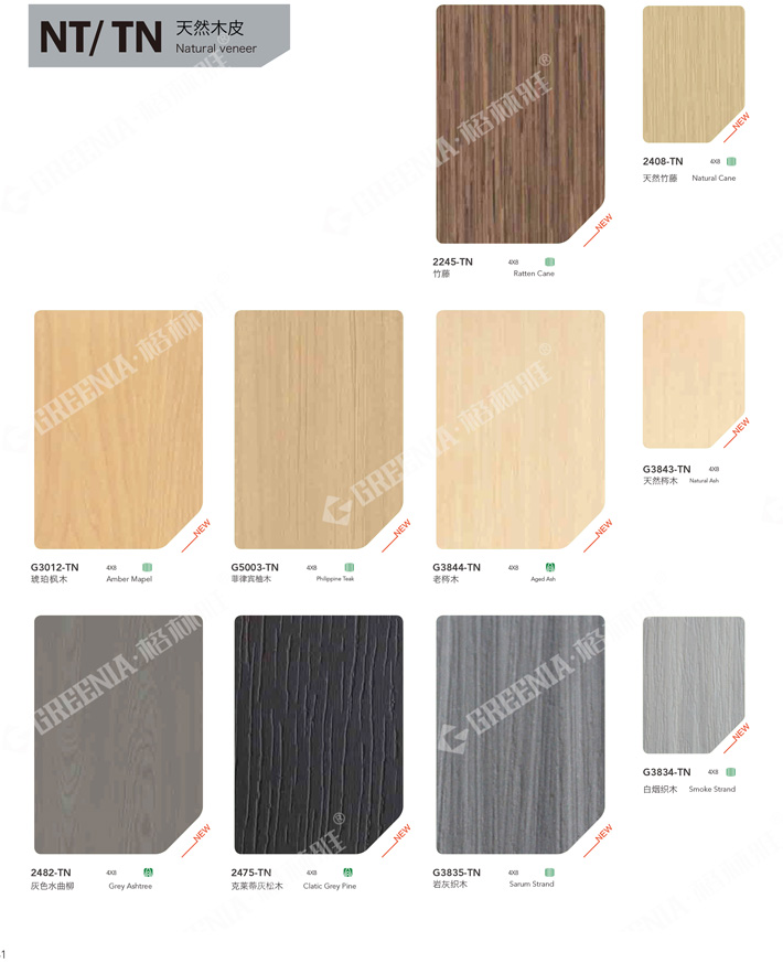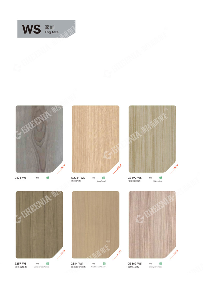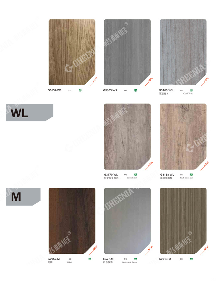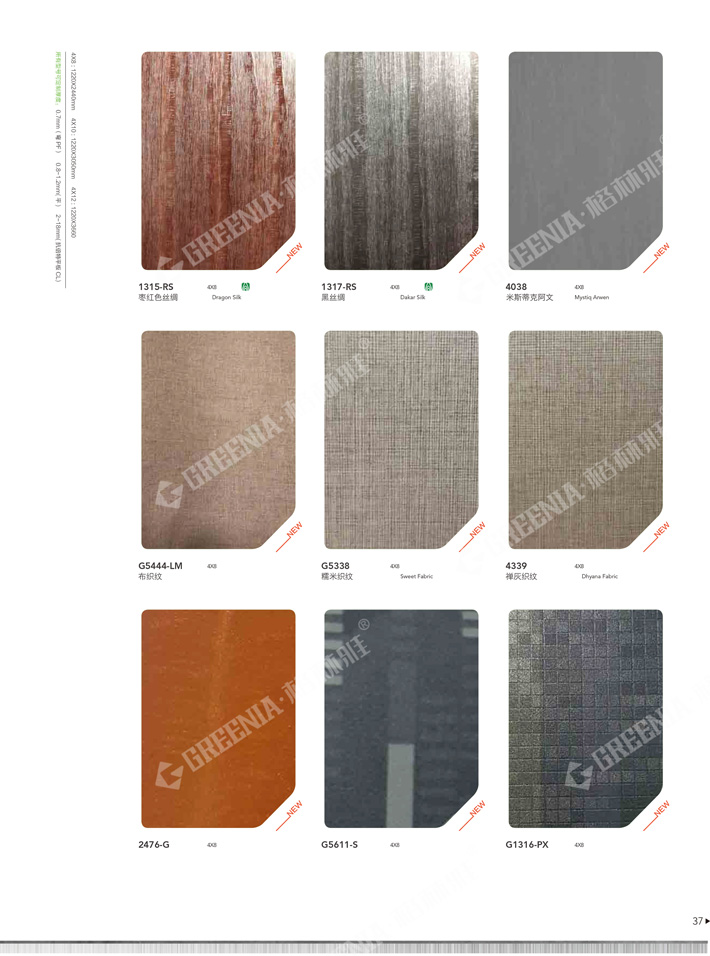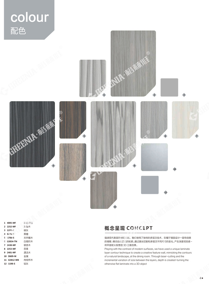 格林雅防火板擁有55種表面處理及3532種花色紋路,品種齊全。包括光面G、啞面M、絨面S、油漆P、霧面WS、波浪紋RS、壓木紋X、編織紋PX、優雅皮紋XO、皮紋SL、壓木紋SH、拉絲ST、刷木紋F、優雅刷木紋MF、絲絨面CF、羽翎面FT、纖絲紋、天然木皮、影點U、橫紋E、豎紋H、雨絲紋MV、橫紋WH、原木刷紋WB等多種不同的表面處理,可做成平板、彎曲板。歡迎您來樣定做!
