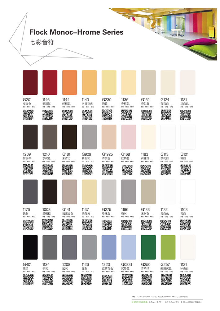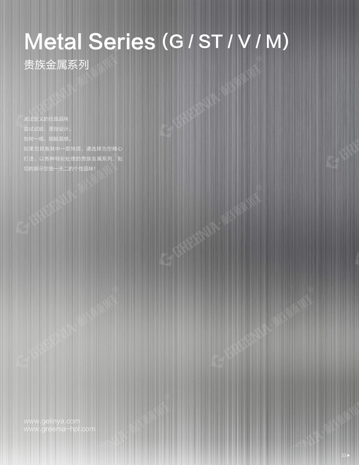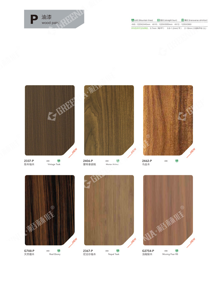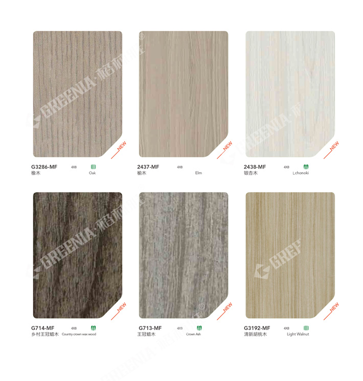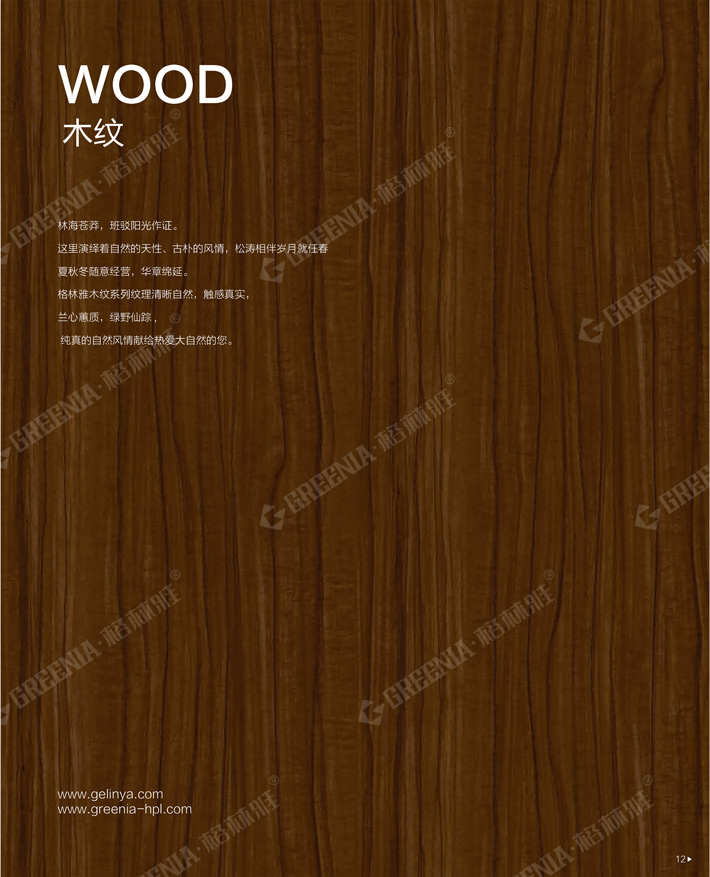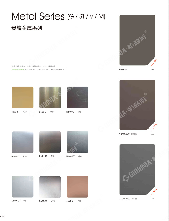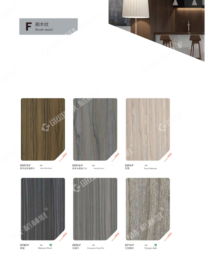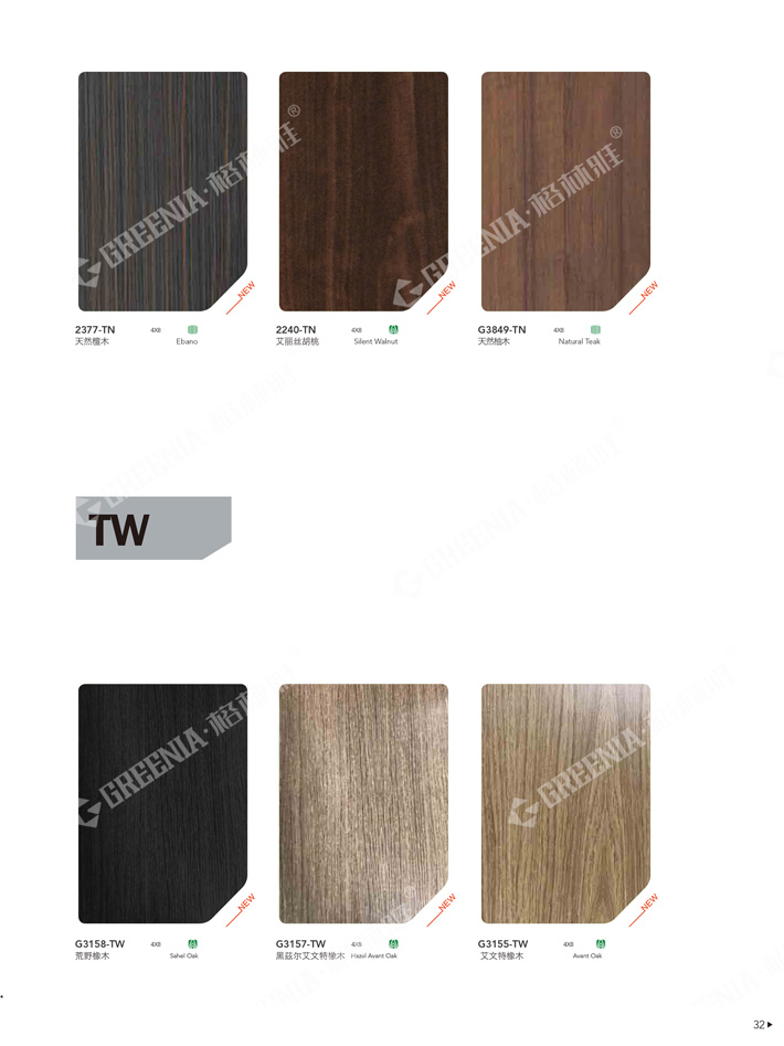 格林雅防火板擁有55種表面處理及3532種花色紋路,品種齊全。包括光面G、啞面M、絨面S、油漆P、霧面WS、波浪紋RS、壓木紋X、編織紋PX、優雅皮紋XO、皮紋SL、壓木紋SH、拉絲ST、刷木紋F、優雅刷木紋MF、絲絨面CF、羽翎面FT、纖絲紋、天然木皮、影點U、橫紋E、豎紋H、雨絲紋MV、橫紋WH、原木刷紋WB等多種不同的表面處理,可做成平板、彎曲板。歡迎您來樣定做!